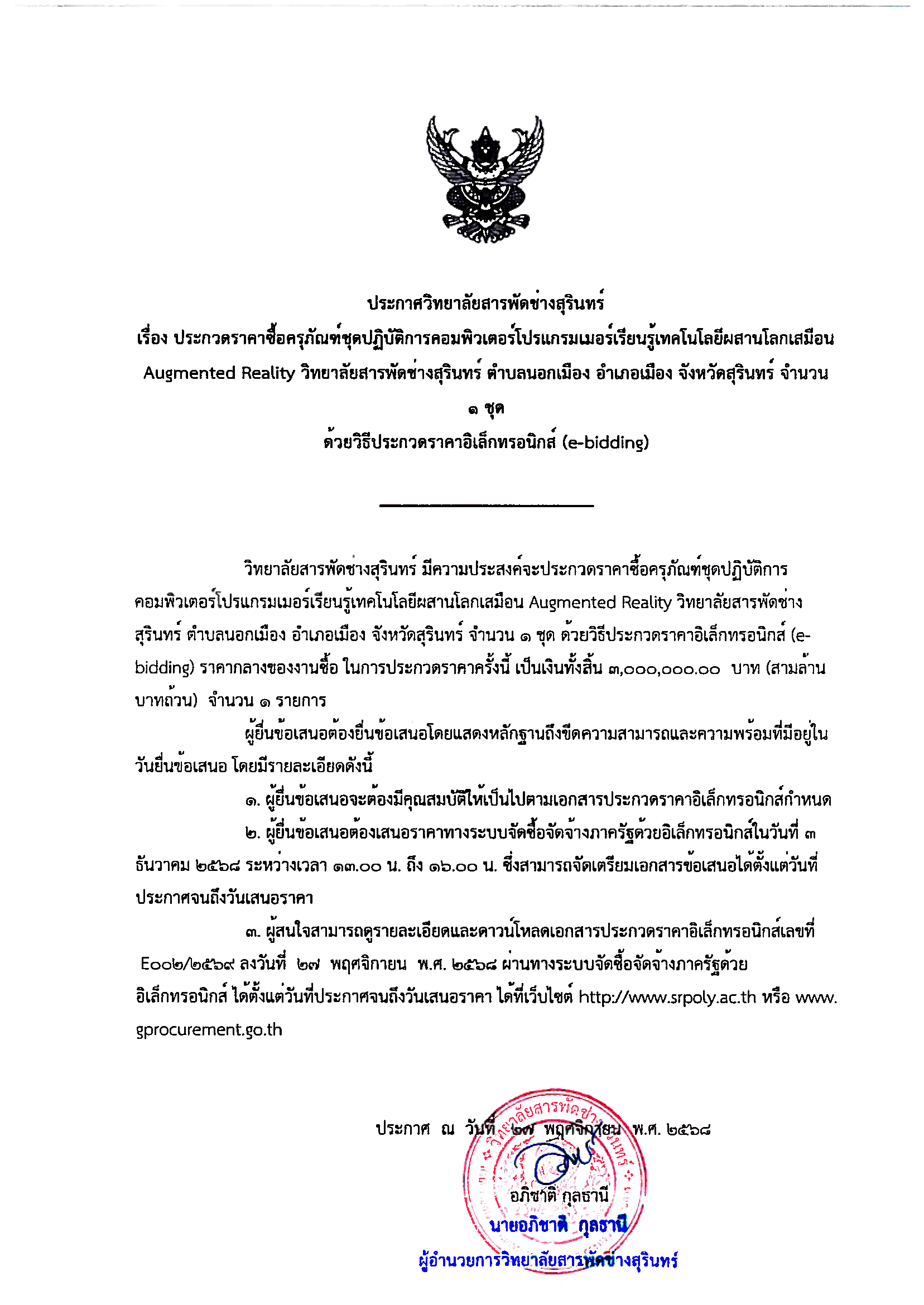 28/11/68: ประกวดราคาครุภัณฑ์ชุดปฏิบัติการคอมพิวเตอร์โปรแกรมเมอร์เรียนรู้เทคโนโลยีผสานโลกเสมือน Augmented Reality จำนวน 1 ชุด ด้วยวิธีประกวดราคาอิเล็กทรอนิกส์ (e-bidding)