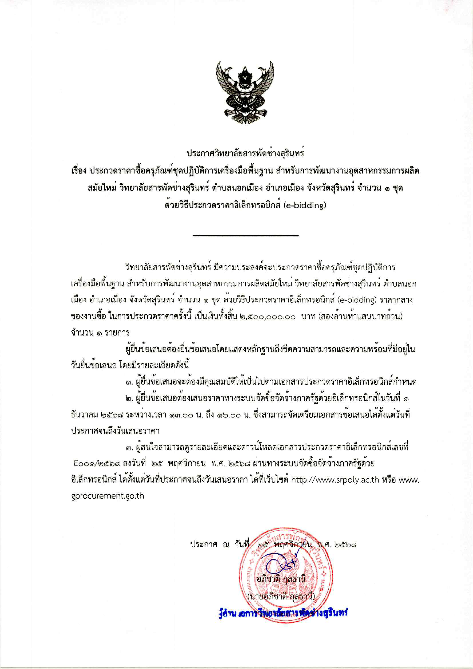 26/11/68: ประกวดราคาครุภัณฑ์ชุดปฏิบัติการเครื่องมือพื้นฐาน สำหรับการพัฒนางานอุตสาหกรรมการผลิตสมัยใหม่ จำนวน 1 ชุด ด้วยวิธีประกวดราคาอิเล็กทรอนิกส์ (e-bidding)